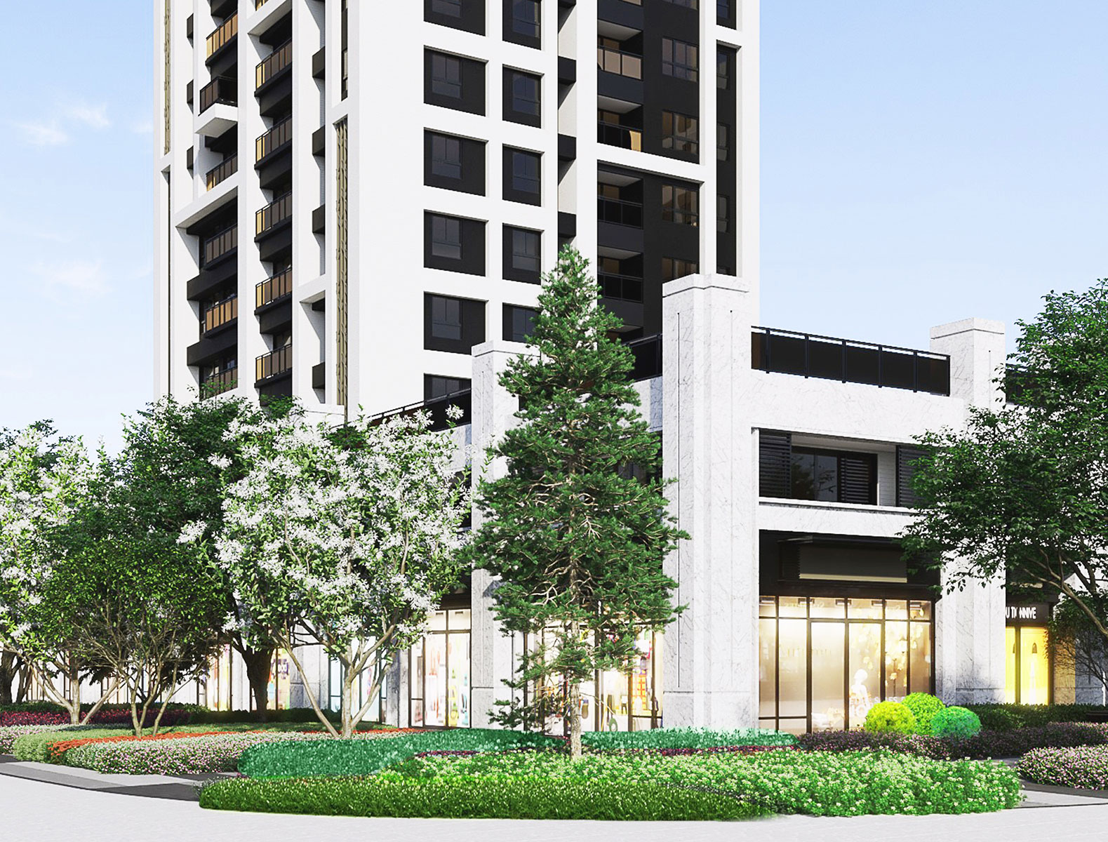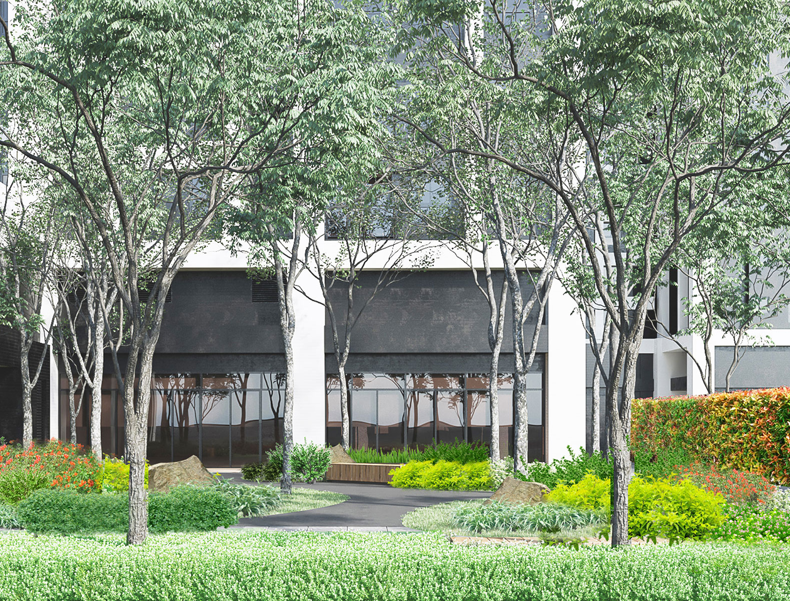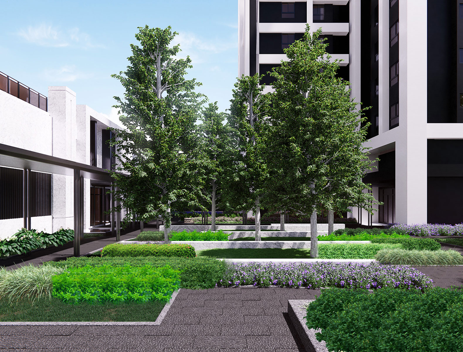 延續基地周邊綠地的濃密綠蔭氛圍,無論於沿街開放空間或住宅院落空間中,均以高綠覆配置方式以及運用能適應竹北當地多強風特色的植栽種,創造出都市中難得的綠境居所。