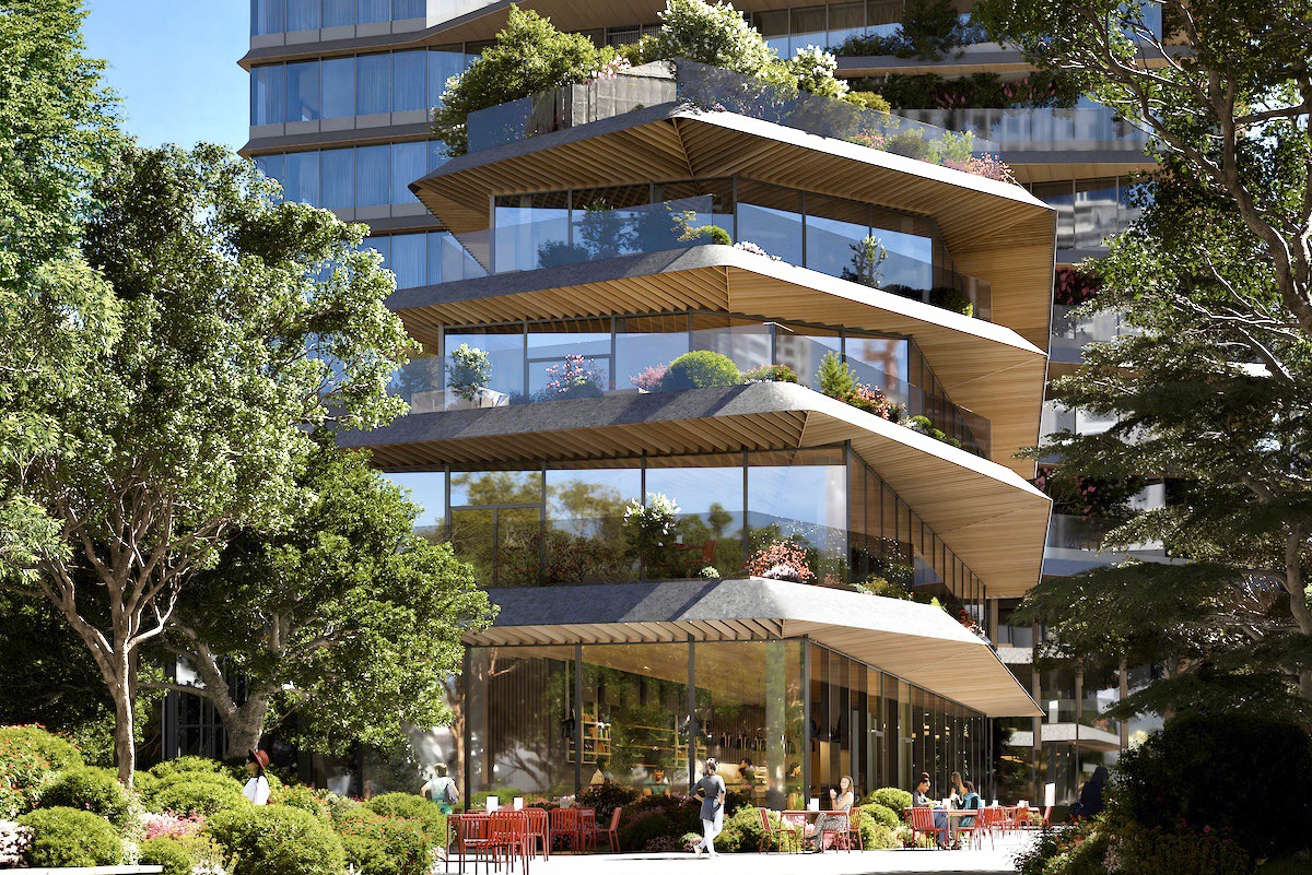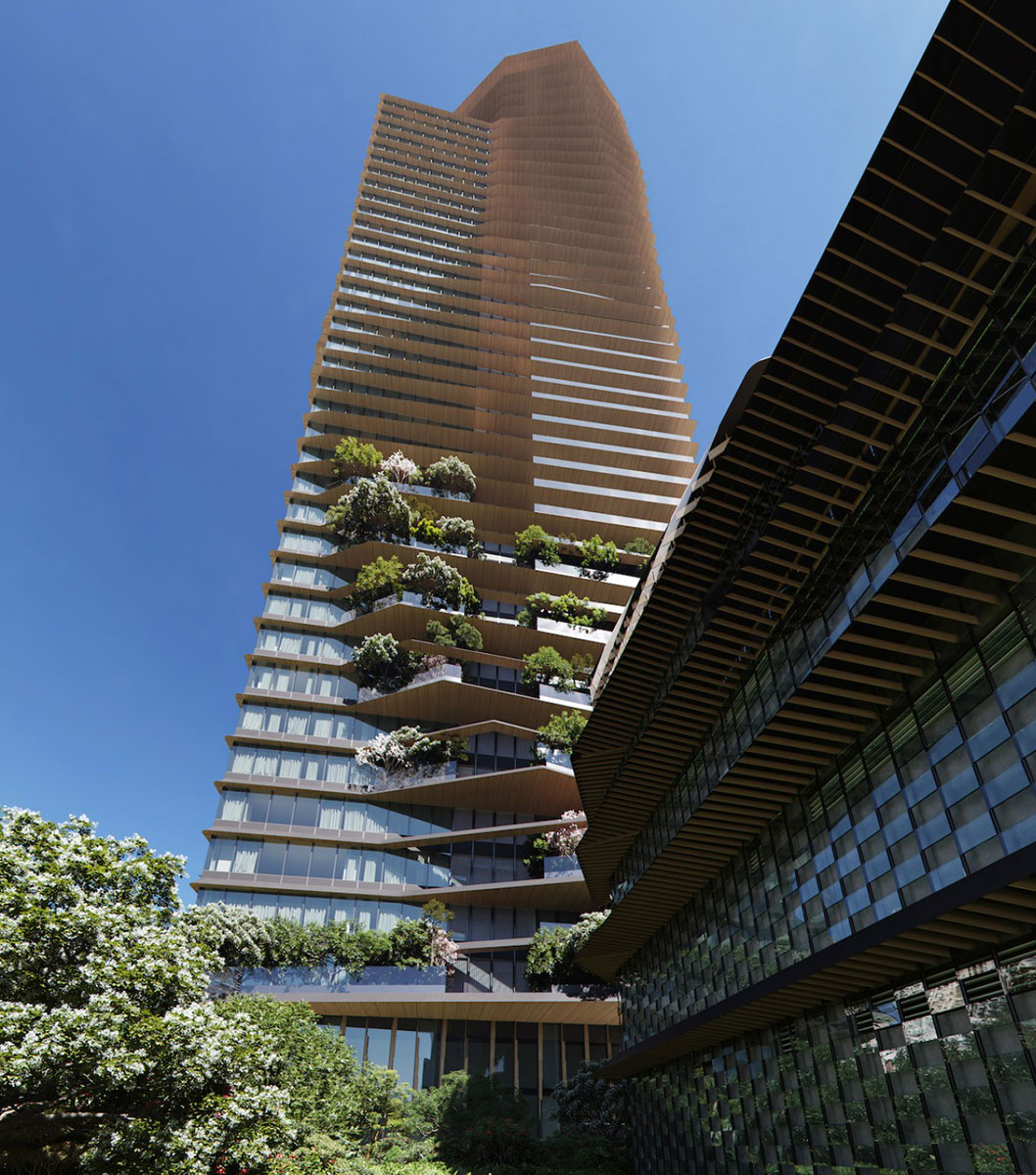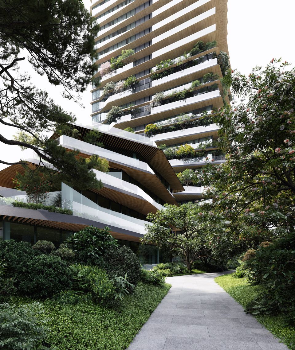 由聯聚建設攜手打造東京奧運主場館與台中巨蛋的日本建築師隈研吾於市政路商業核心擘劃42層典雅商辦空間,上森於其中則以適地適木為利用台灣原生種大小喬木、灌木營造具在地特色的都市景觀綠洲。