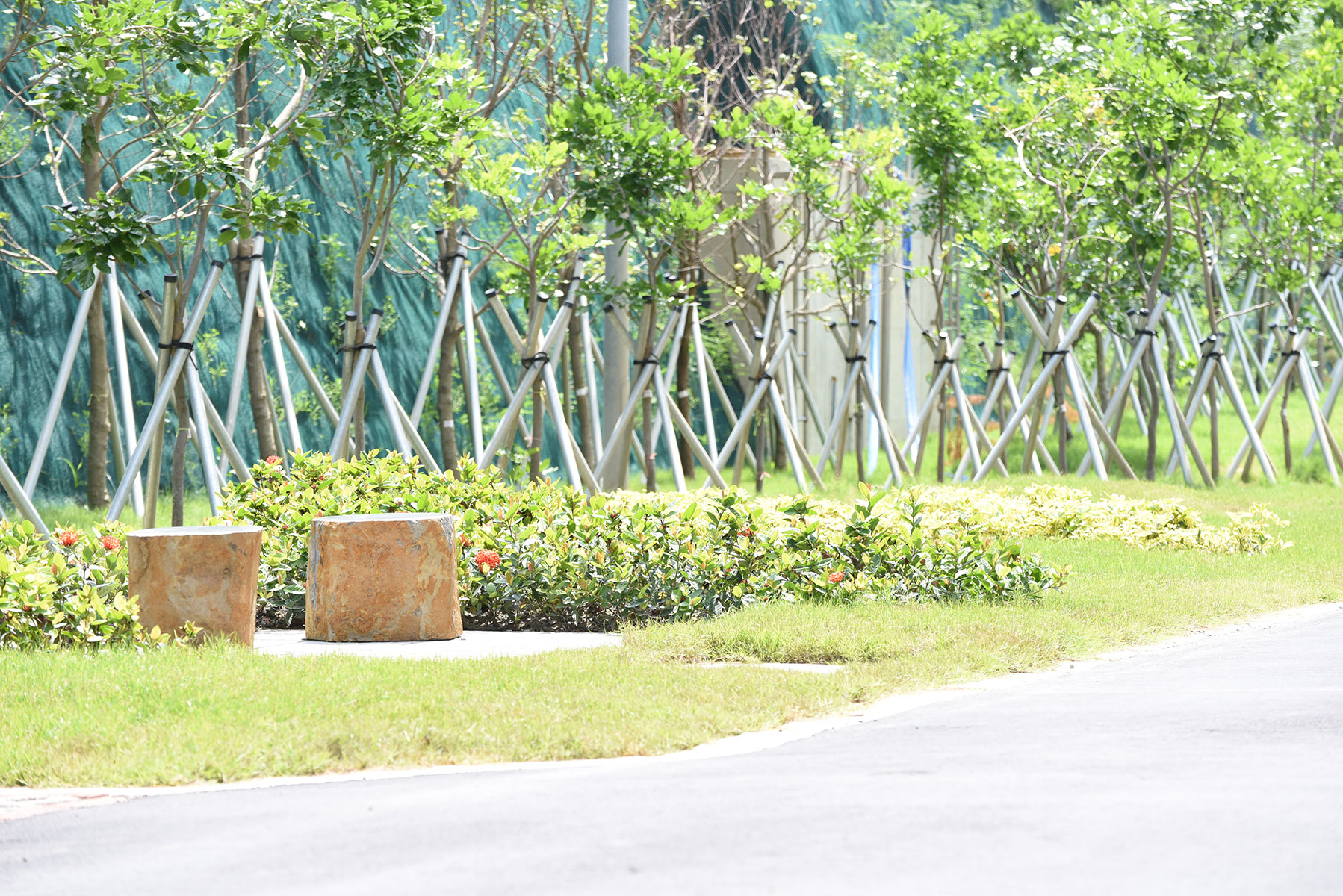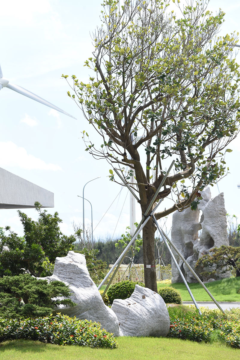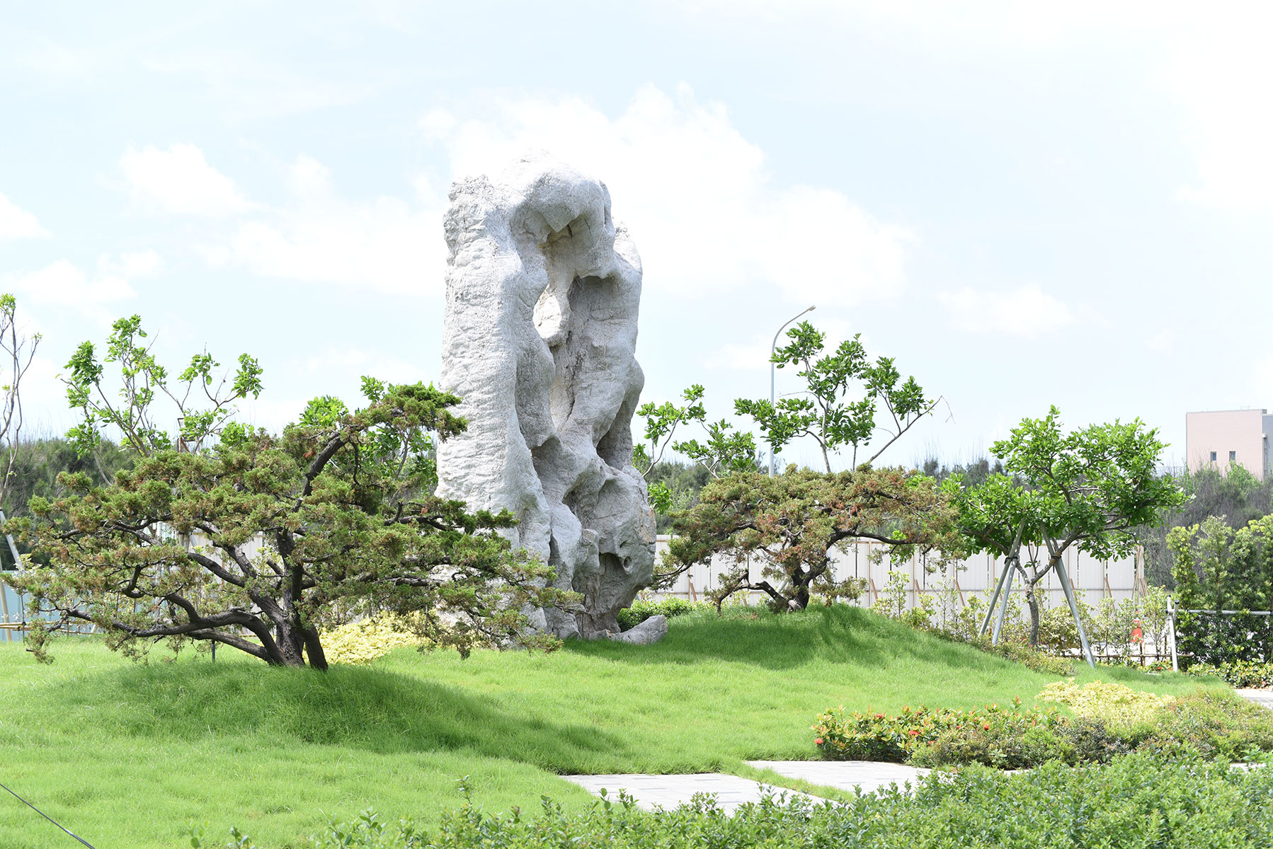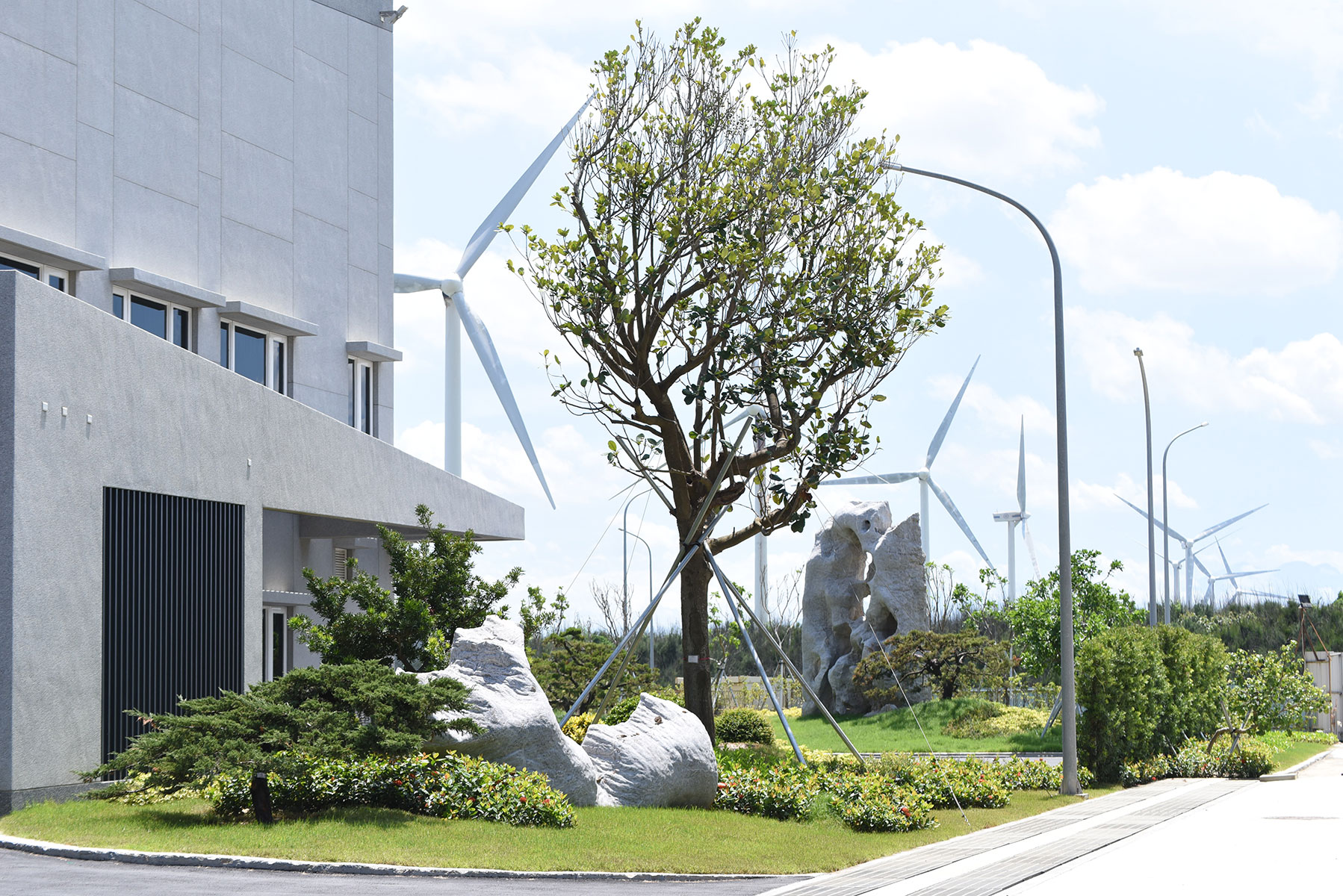 豐堉資源彰濱廠位於彰濱工業區線西區內,為豐興鋼鐵關係企業,核心事業以「廢棄物清除管理、處理」、「廢轉能」及「資源再利用處理」為主軸,規劃時以簡明素雅的庭院空間為主軸,並將董事長摯友相贈之靈壁石、真柏、羅漢松點綴其中,同時考量基地緊鄰海濱,特別選用耐鹽性佳的草種海雀稗,並於種植前回填紅土做保護層,避免高鹽分地下水影響植栽生長,期許該廠得有靈石相佐、綠意常伴。