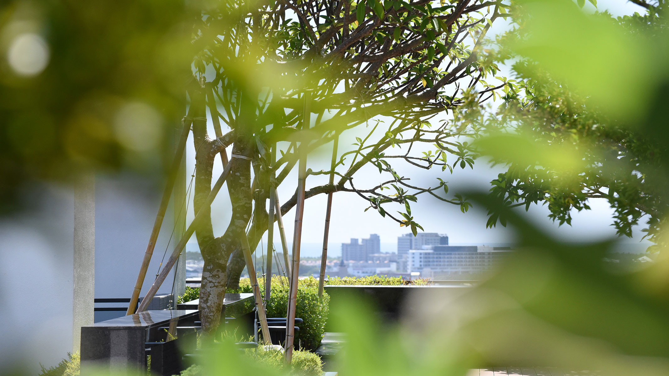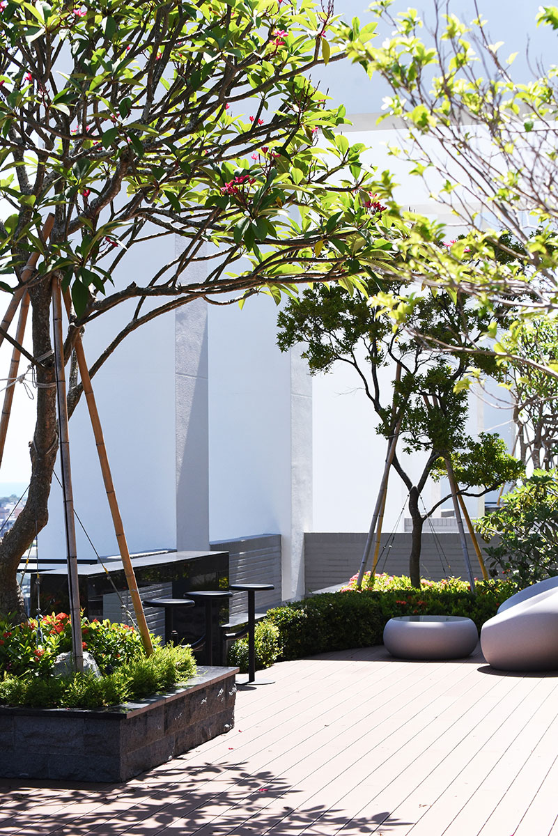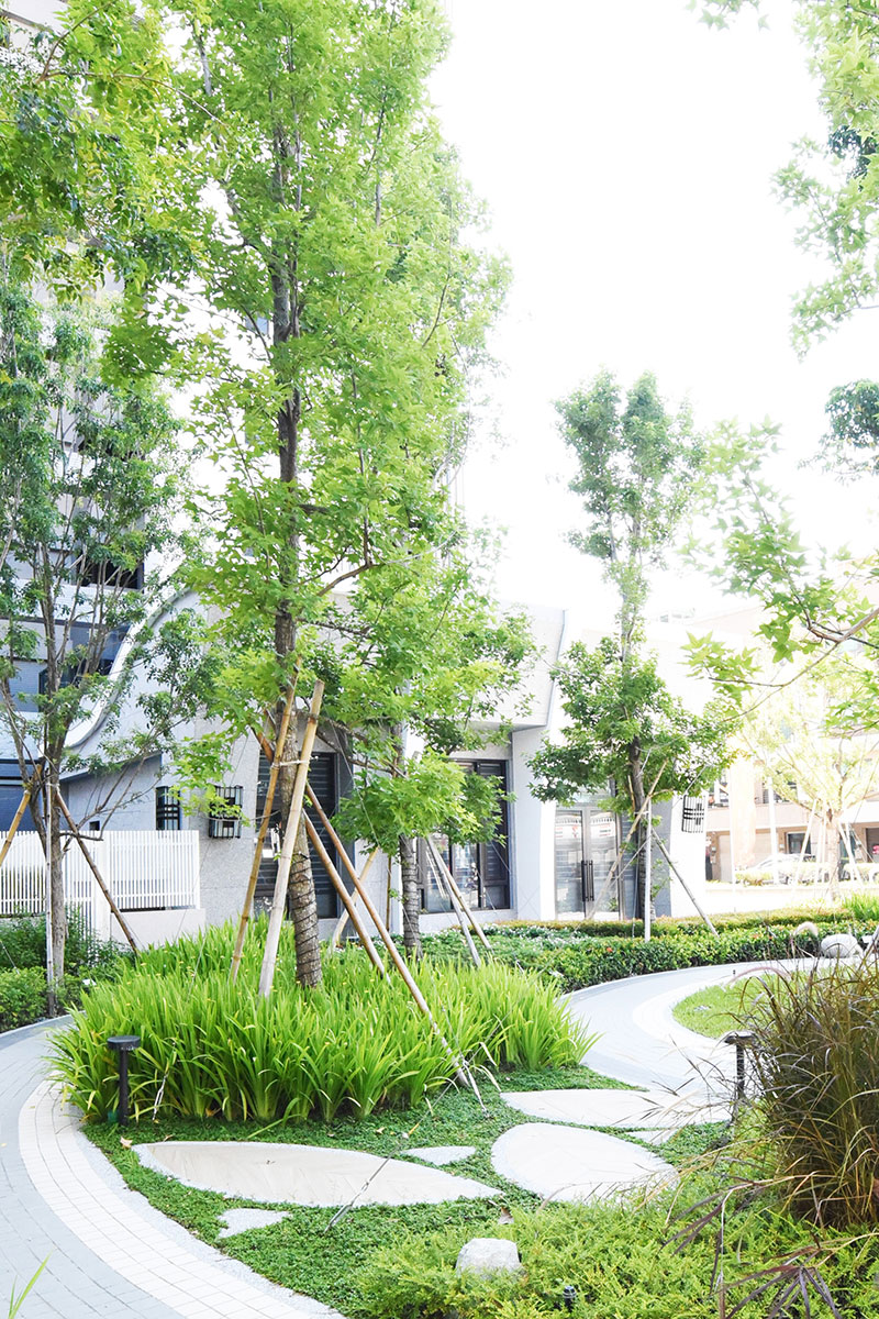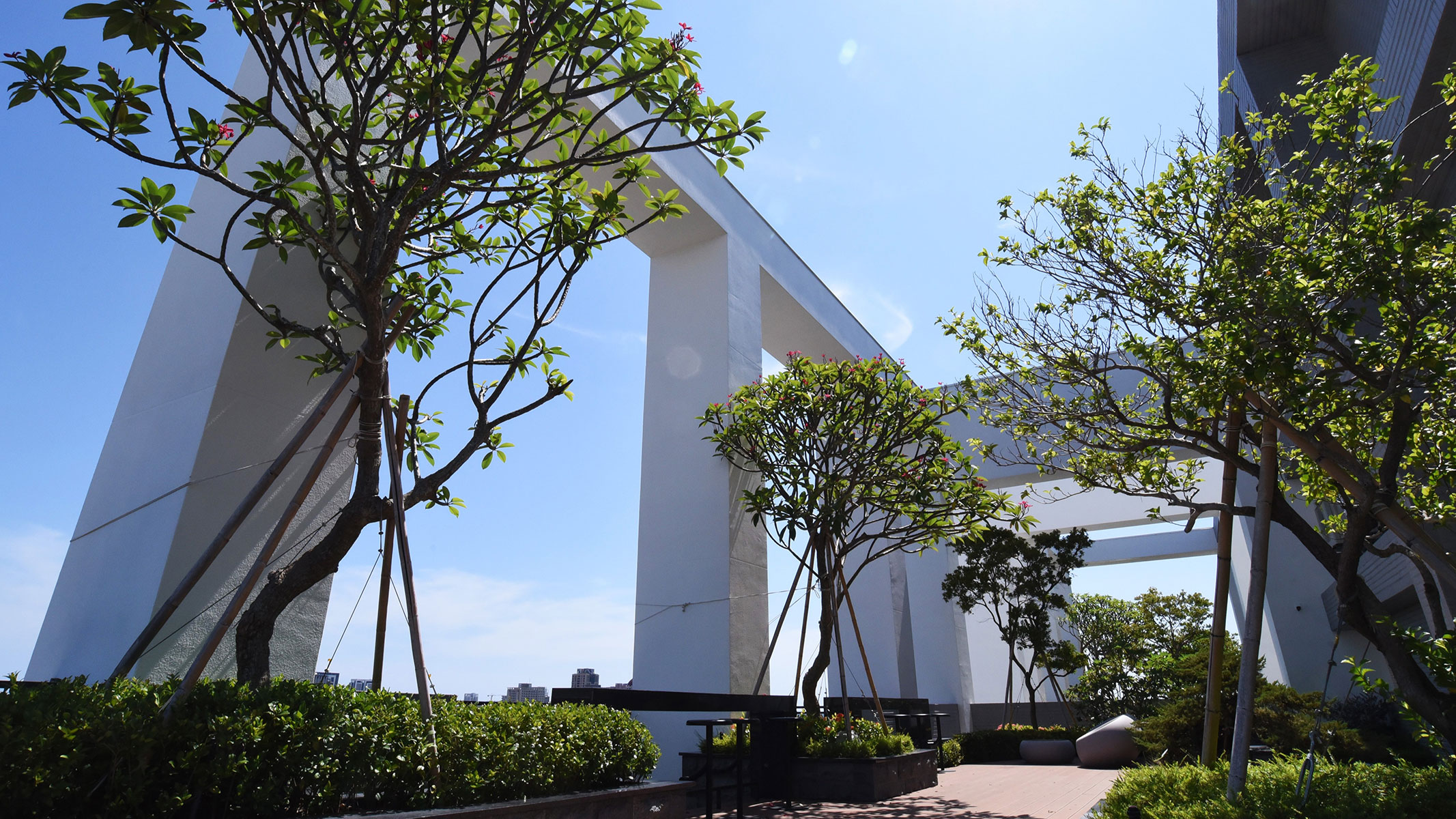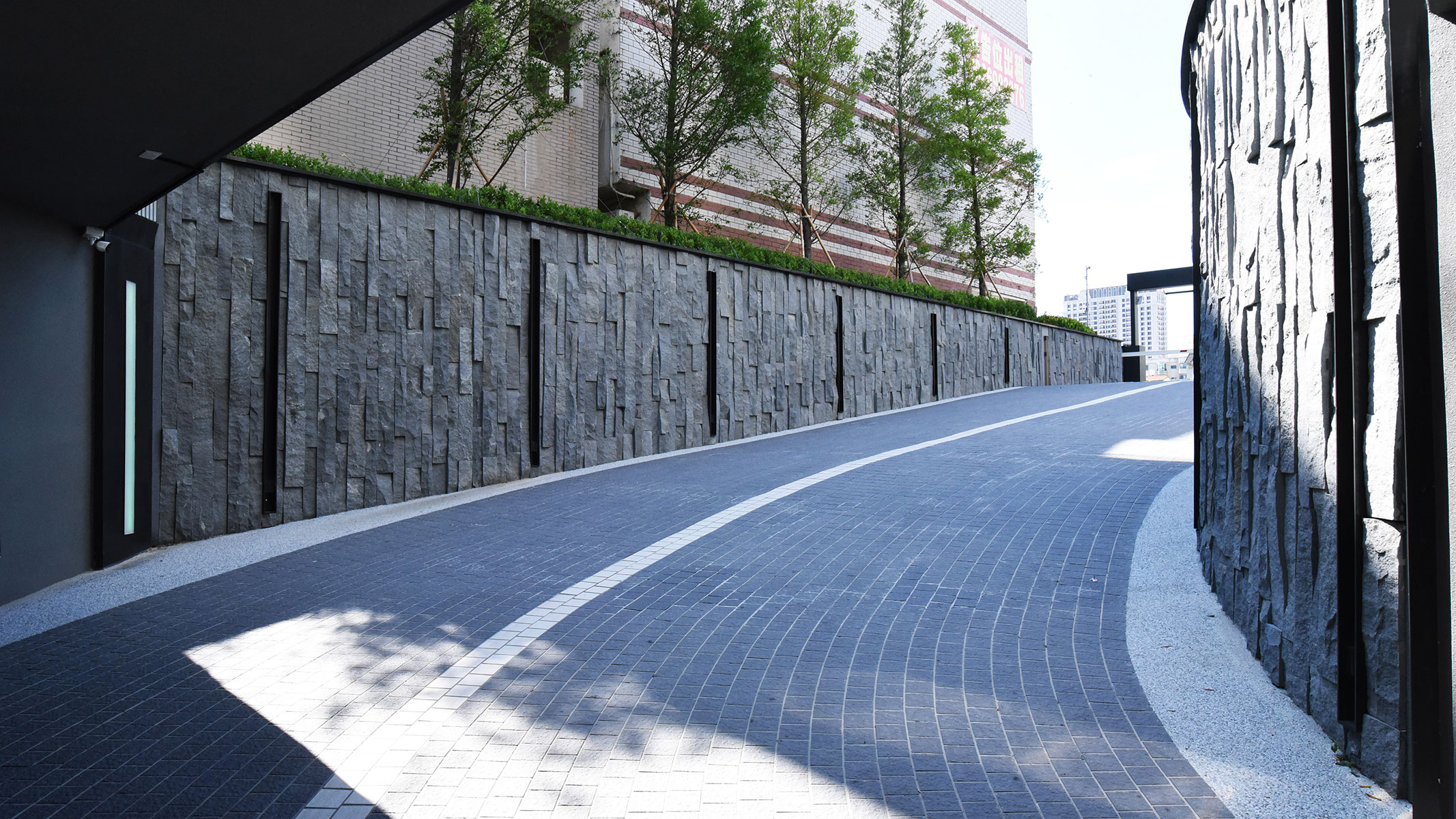 本案位處台南民權路四段及湖美街交叉口,基地原為安平運河舊道,因此規劃之初即運用弧形、灰色調地坪色彩的交錯與於基地東北側規劃完成的綠地並種植平原地區水岸邊代表性的樹種茄苳樹做為主樹,來彰顯基地與水相生的歷史區位特質。也因其南側近鄰安平運河、北側為低密度透天聚落的永久棟距優勢,特別於屋突規劃舒適的眺景空間,為住戶提供僅屬此案才得享有的難得景緻。