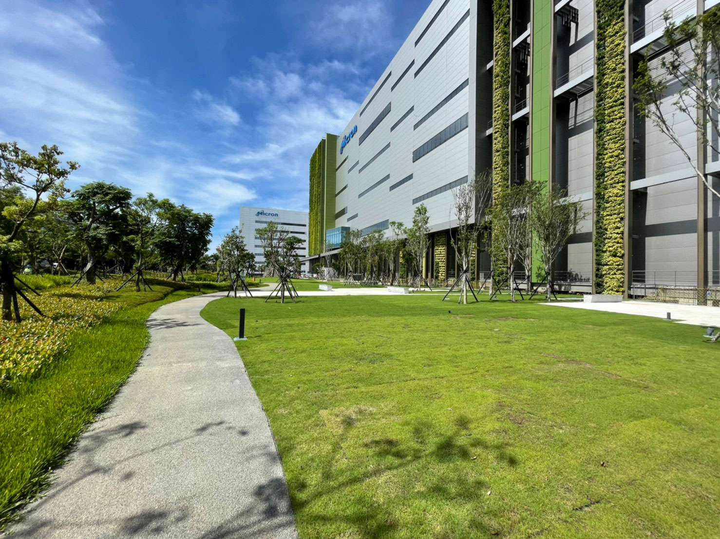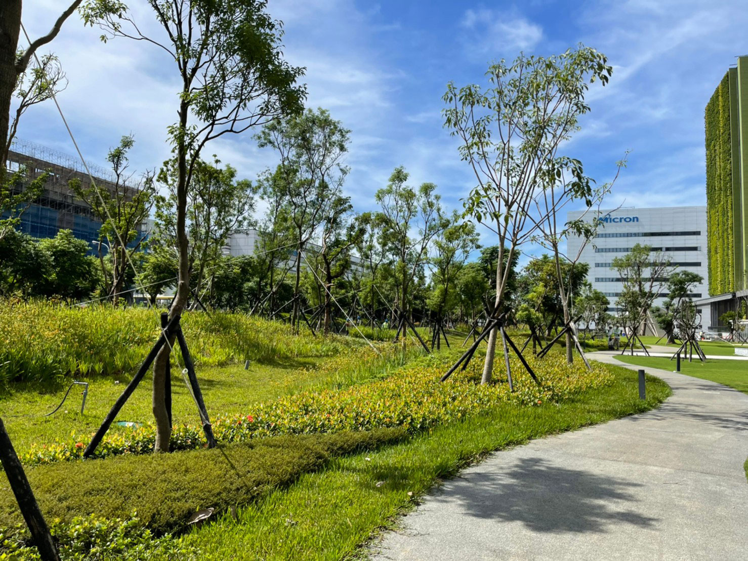 記憶體大廠美光科技於台中市后里區新建A3廠房並於2021年底正式啟用,榮幸承接互助營造的景觀綠化工程面積達25,000m2內含2,500m2兼具滯洪及保水的雨水花園,並榮獲美國LEED綠建築認證標章,也於園區內種植大樟樹延續后里區域大彰公庇護的永續傳承。