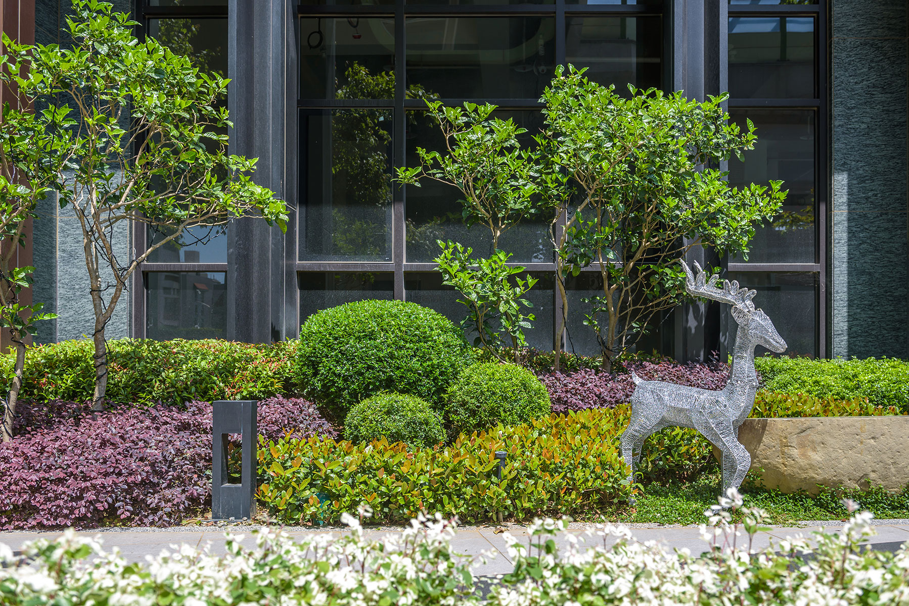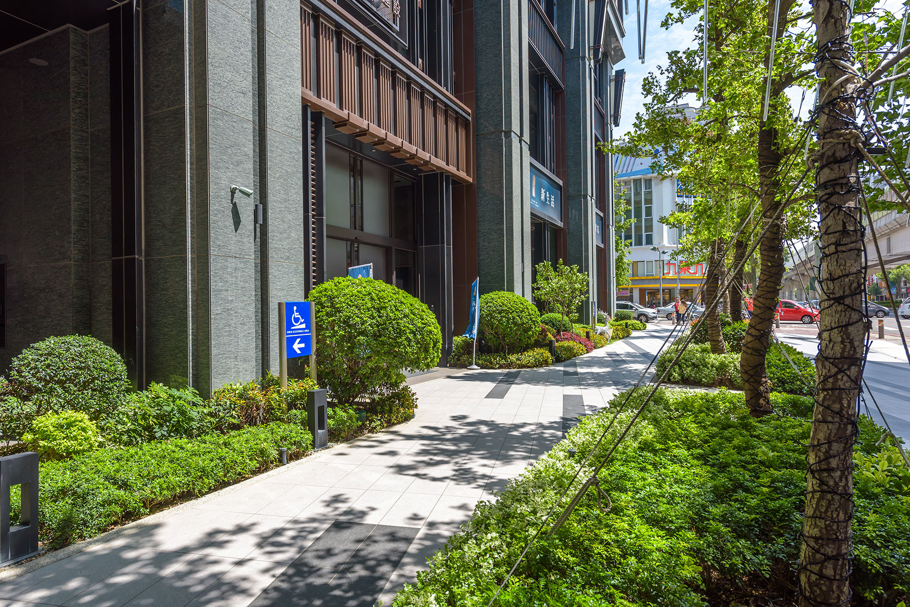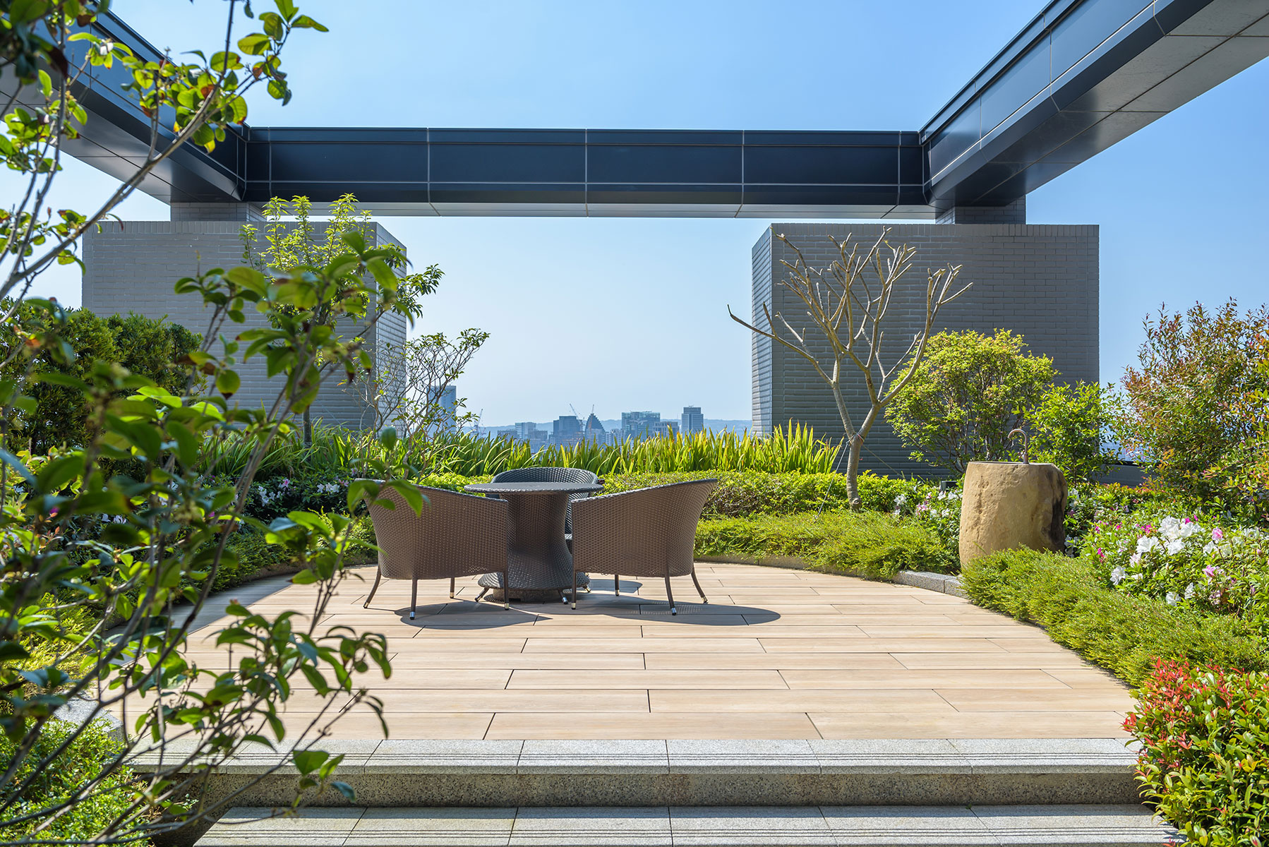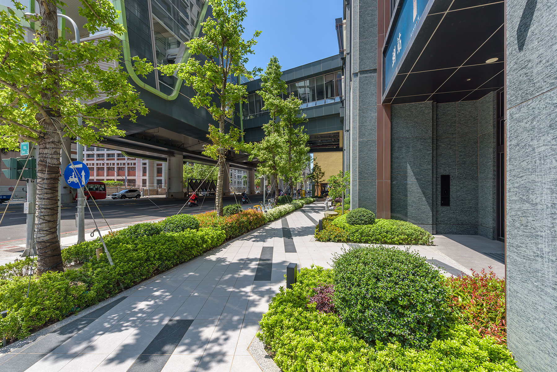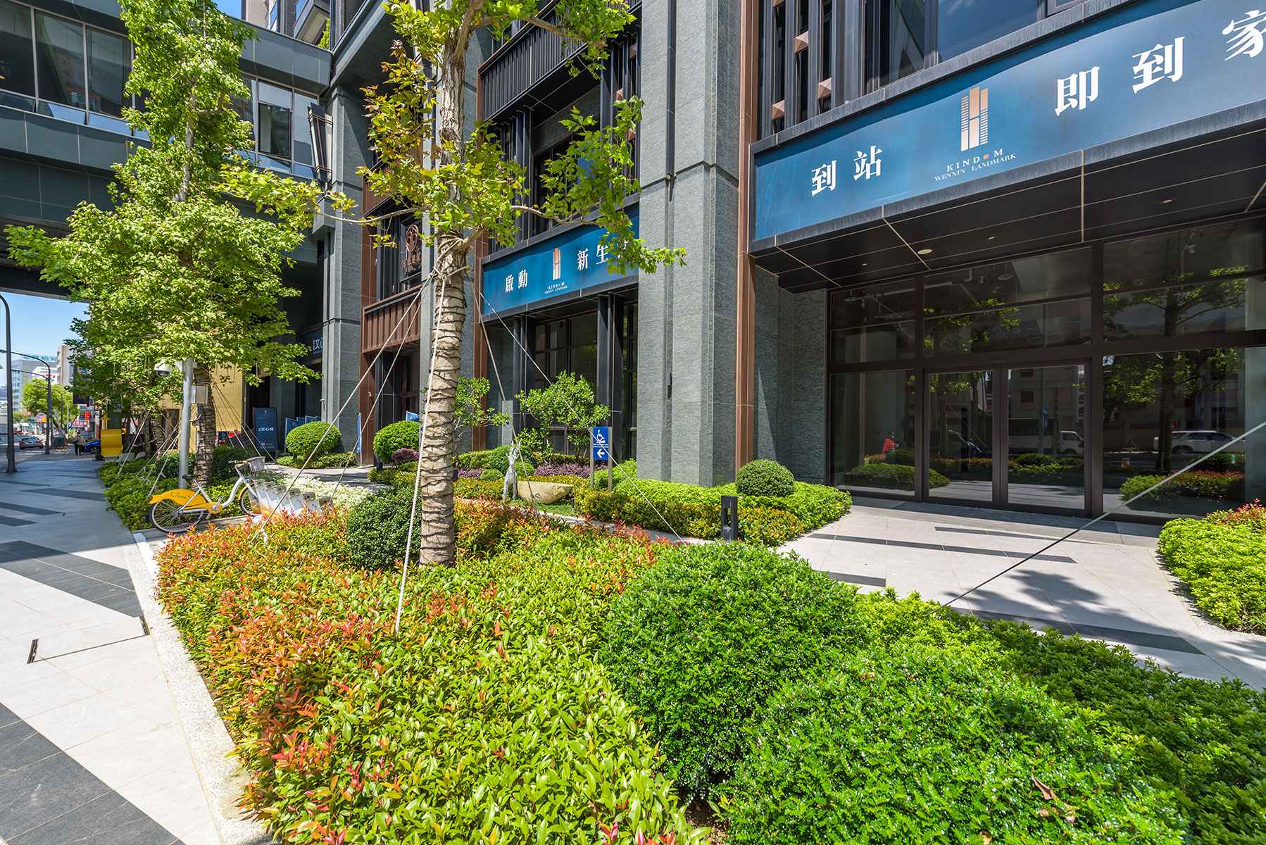 冠德建設於台中市精華區首座共構地標宅,到站即到家的創新居家型態,臨40米寬文心路側種植台灣原生種楓香大喬木創造四季變化,四樓戶外平台種植皆為台灣原生種青剛櫟及櫸木創造空間層次及遮陰的場域,點景種植白水木的獨特姿態,頂樓主要種植青剛櫟及點綴嘉寶果增添住戶觀賞及採果的樂趣。