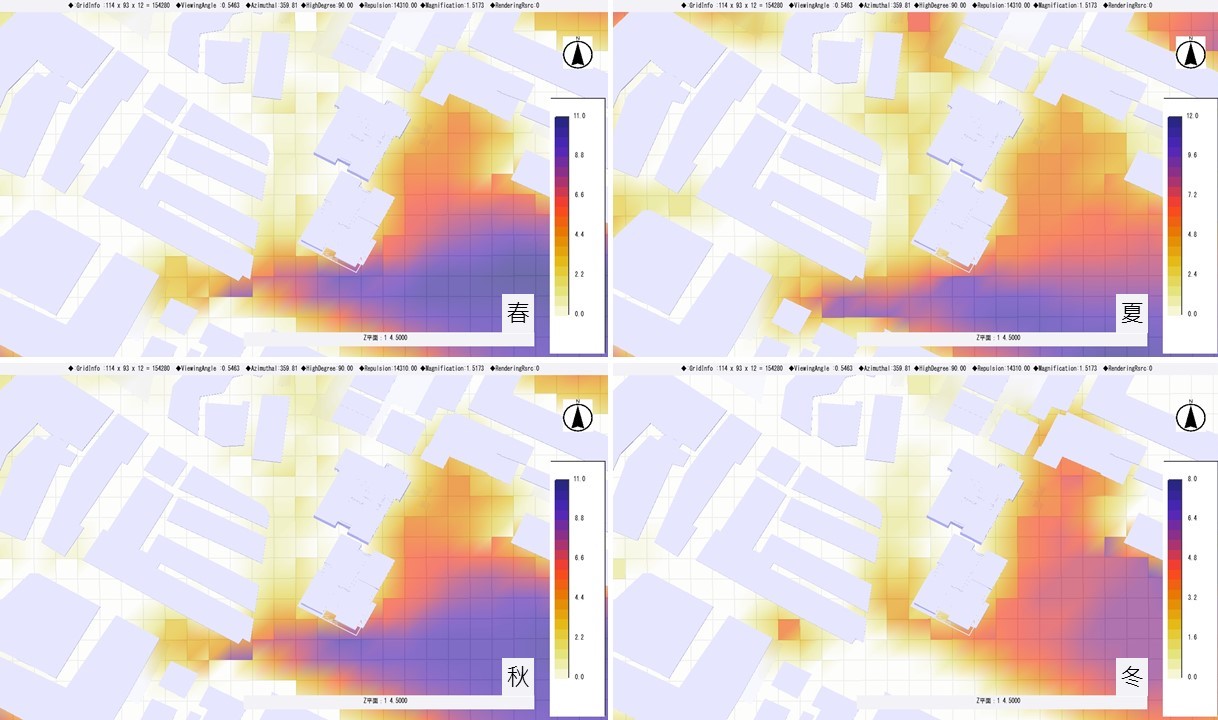 如上圖案例顯示,受建物樓高影響,西北側全日均受建物陰影影響,故建議運用於短日照環境仍可生長良好的植種來營造此區的景觀特色。