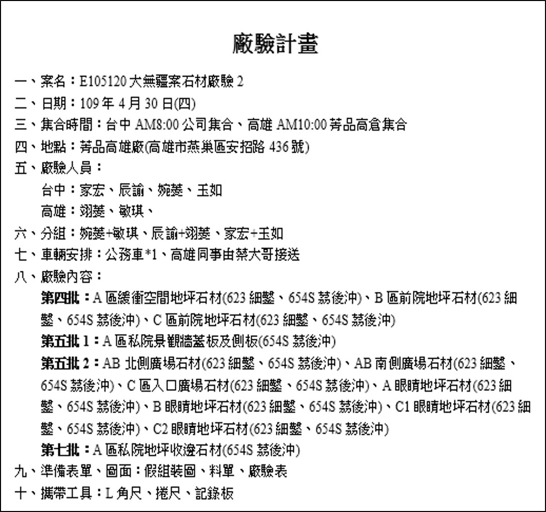 > 安排加工查驗:與廠商規劃加工順序及查驗時程。
