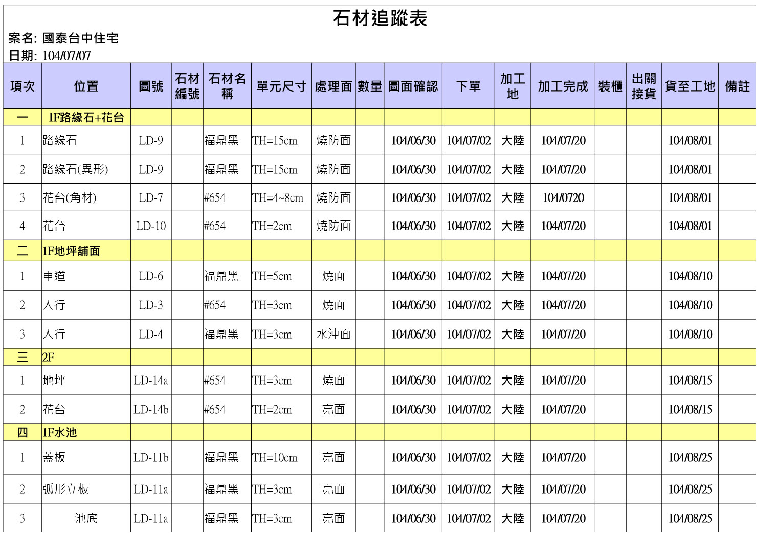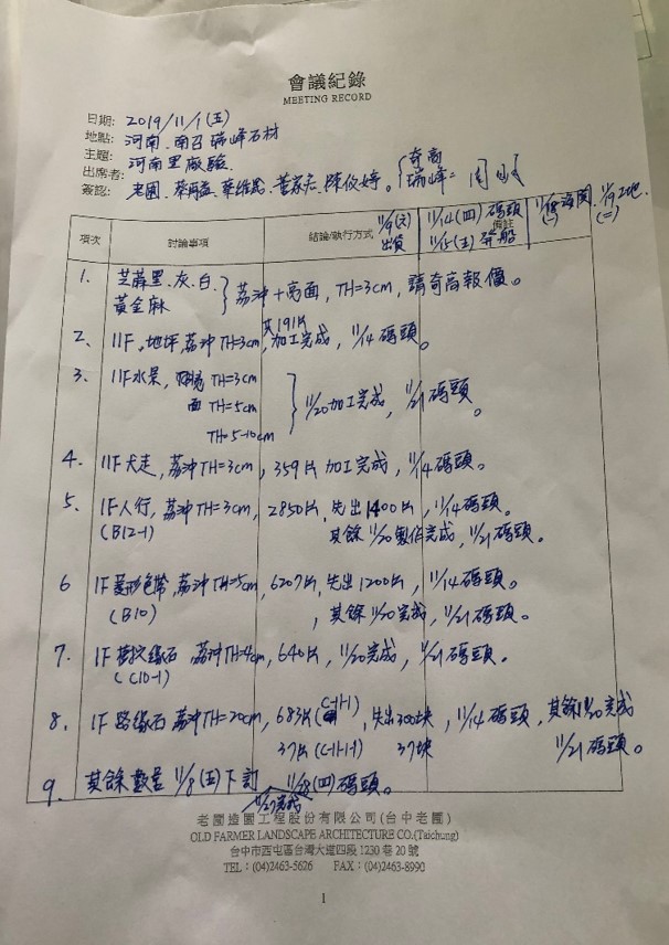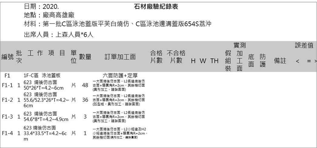 為使景觀石材工程施作能符合規定、尺寸及品質等要求,我們將會進行石材廠驗作業,到加工廠為石材製品進行各項檢查作業,以確保運至工地後能準確的施工。
