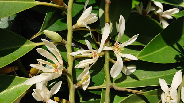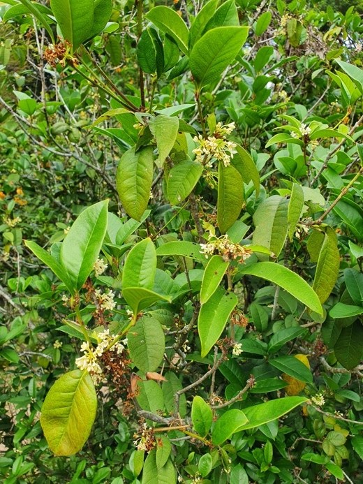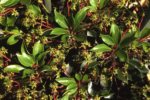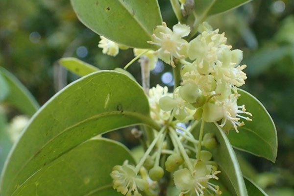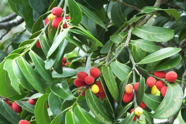 自然狀態中它是堅硬抗風物種,單葉革質,葉片歪基且呈歪長卵形,一般植物描述都說是「鐮刀型」。花腋生,果熟由綠轉紅的橢圓體。