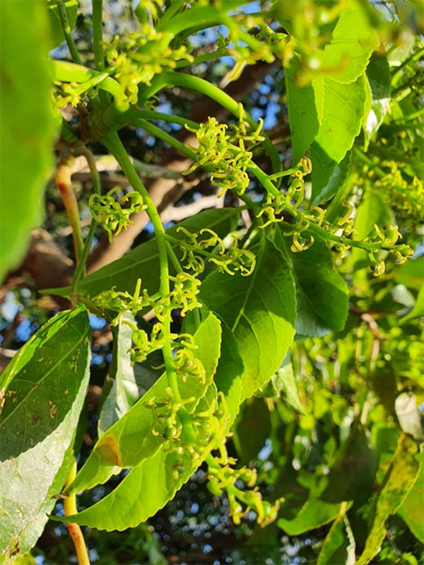 它是落葉小至中喬木,二回奇數或偶數的羽狀複葉,羽軸的基部膨大;直立頂生的密錐花序(thyrses)很有趣,也就是混合花序,以主軸為圓錐狀的無限花序(monochasium)。末梢的單出聚繖花序單位,中間的花可以是雌花或雄花,但側面的一定是雄花。