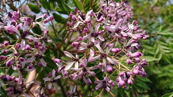 無論從河堤、砂岸、墳頭、道路旁,楝樹就是一把把綠傘,在貧瘠的土地上,滋長溫柔的庇蔭。而它的春花,鑲著細細碎碎的紫色邊,美得心細,香得提神,紫暈由獨熾一格的青綠襯底,青綠葉又二、三回交疊迴唱;尤為厚實有力道的,旋轉性不一的樹皮,隨著樹齡增長,讓人心依止,讓鄉土意念著床。苦楝一夢、台灣情長。
